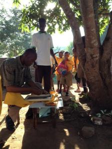 It was an hour and a half journey to where the function was being held but before we got there we stopped at an unoccupied school where I was informed we could ‘relieve’ ourselves. This was the time I was dreading but when you got to go you got to go! Alex fetched my camp toilet disguised in a blue carrier bag and James walked me over the school latrines. He checked each one but all were disgusting with faeces all around, flies buzzing in and out of the ‘hole’ and many didn’t even have doors! He chose the least disgusting and helped me set up the toilet in one corner. When the door closed I could hardly see, I dreaded to think what I was standing in and worse with my Gomez on it was a hell of a job to keep it all from touching the ground! When I escaped into the fresh air and sunshine again my dress was all tucked up and very uncomfortable. James was just about to call my two ‘attendants’ from earlier in the day when I spotted James’ Mother-in-law and other ladies I recognised who were only too happy to help sort me out and catch up with news about Moureen and her lovely family back in the UK. I was glad of all the attention my Gomez got throughout the day as it kept slipping, twisting and dragging on the ground! I should have had a lesson on how to wear and walk in it!